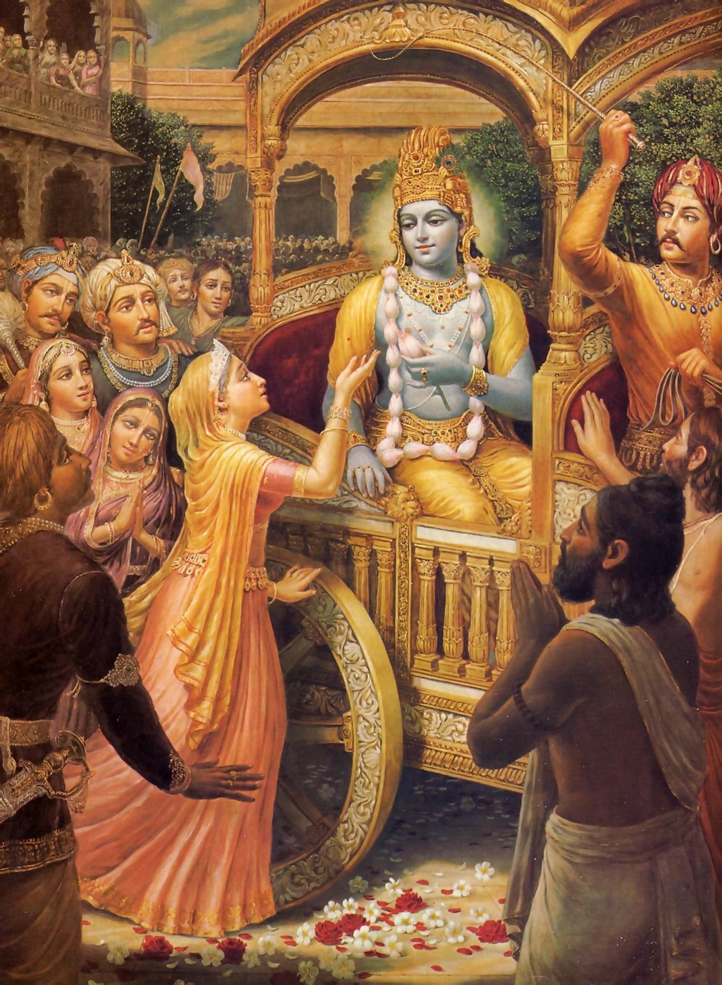 Оно напоминало скопище молодых облаков, выросших в небе, а его неземное сияние, казалось, затмевало лучи самого солнца. Просторный дворец радовал гостей приятной прохладой, одновременно поражая их взор очаровательными формами и богатым убранством. Золотые стены и выложенные небесными каменьями своды, отделанные кораллами хрустальные лестницы – все это делало его более величественным, чем даже Судхарма – дворец в столице Яду.