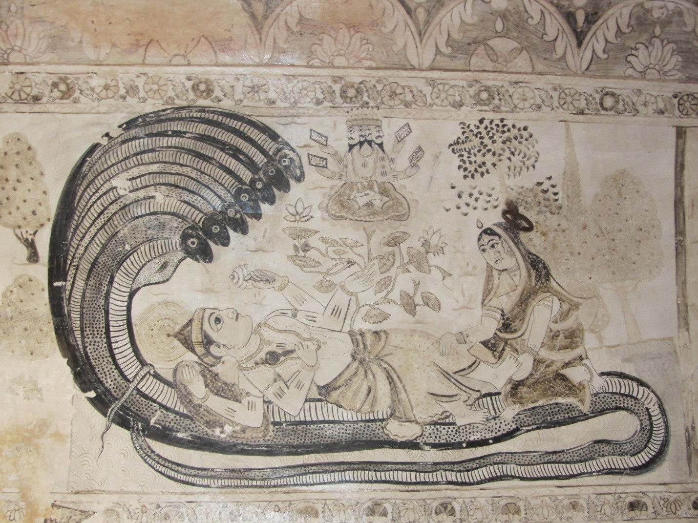 В водах Причинного Океана стоит огромный дворец. Вокруг него и в нем возвышаются тысячи колонн, сделанных из драгоценных камней и излучающих чудесное сияние. В этом дворце пребывает гигантская форма Анантадевы, который известен также под именем Шеши. Анантадева, или Шешанага, имеет форму огромного змея с тысячами капюшонов. Все Его капюшоны украшены драгоценными сверкающими камнями, от которых во все стороны расходится дивное сияние. Каждый из капюшонов Анантадевы имеет по два глаза, взгляд которых внушает ужас. Его тело такого же белого цвета, как вершина Кайласы, всегда покрытая снегом, а шея у Него, так же как и Его языки, синего цвета. На мягком белом теле Шешанаги лежит Маха-Вишну, удобно расположившись на этом ложе. Он всепроникающ и необычайно могуществен. В этой форме Верховный Господь известен под именем Пурушоттамы. Его называют Пурушоттамой, что значит "величайший", потому что из Него исходит другая форма Вишну, которая входит в материальный мир, — Гарбходакашайи Вишну. Господь, пребывающий в форме Маха-Вишну, Пурушоттама, находится за пределами материального мира. Его называют также Уттамой. Тама означает "тьма", а ут — "находящийся за пределами, трансцендентный". Таким образом, уттама означает "находящийся за пределами тьмы материального мира". Тело Пурушоттамы, Маха-Вишну, такого же темного цвета, как грозовая туча в дождливый сезон. Он облачен в нарядные желтые одежды, на Его лице всегда сияет очаровательная улыбка, а Его прекрасные глаза подобны лепесткам лотоса. Шлем Маха-Вишну усыпан драгоценными камнями, а чудесные серьги в Его ушах оттеняют красоту Его вьющихся волос. У Маха-Вишну четыре руки, которые достигают колен. Его шея украшена драгоценным камнем Каустубха, а на груди у Него знак, который называется Шриватса, что значит "место пребывания богини процветания". На Маха-Вишну длинная, свисающая до колен гирлянда, сделанная из цветков лотоса. Эту длинную гирлянду называют гирляндой Вайджаянти.