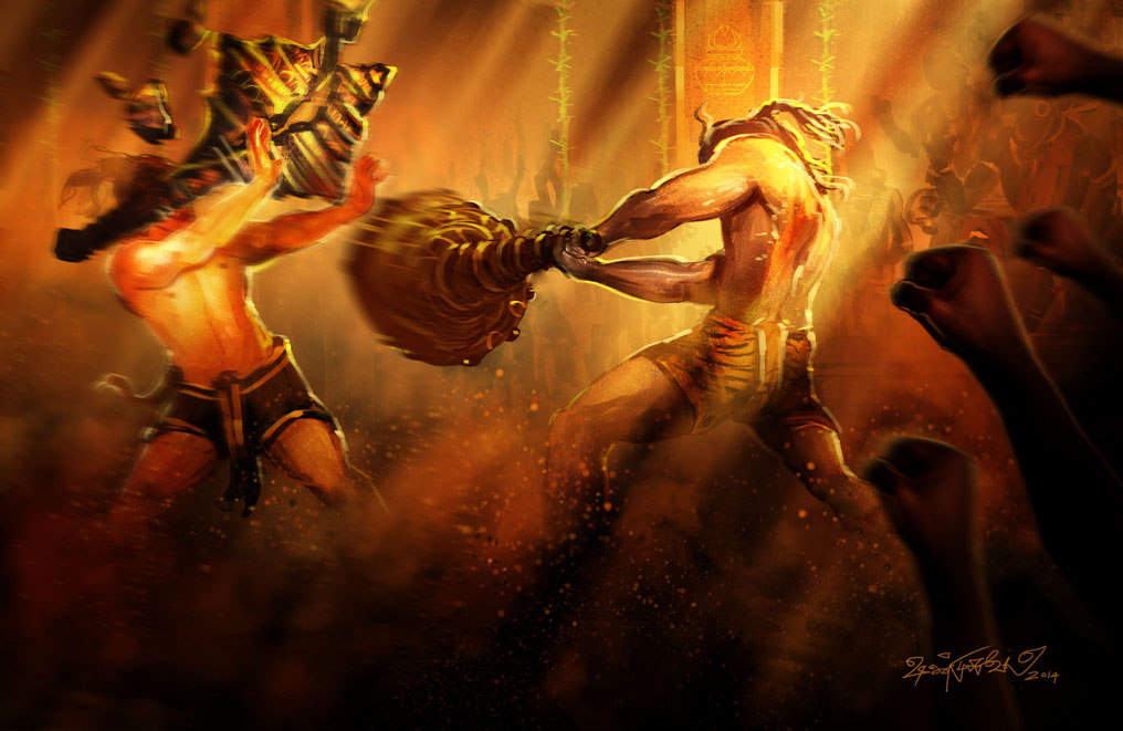 Битва человека с ракшасом разгоралась. Соперники бросали один другого из стороны в сторону и обрушивали друг на друга удары страшной силы. Когда их кулаки сталкивались в воздухе, раздавался гром. Сцепившись, они катались по земле, подминая под себя гигантские деревья. Потом они поднимали с земли эти деревья и бились ими как булавами, а в воздух тогда летели сучья и щепки. Когда же вокруг не осталось ни дерева, соперники пустили в ход камни и валуны.