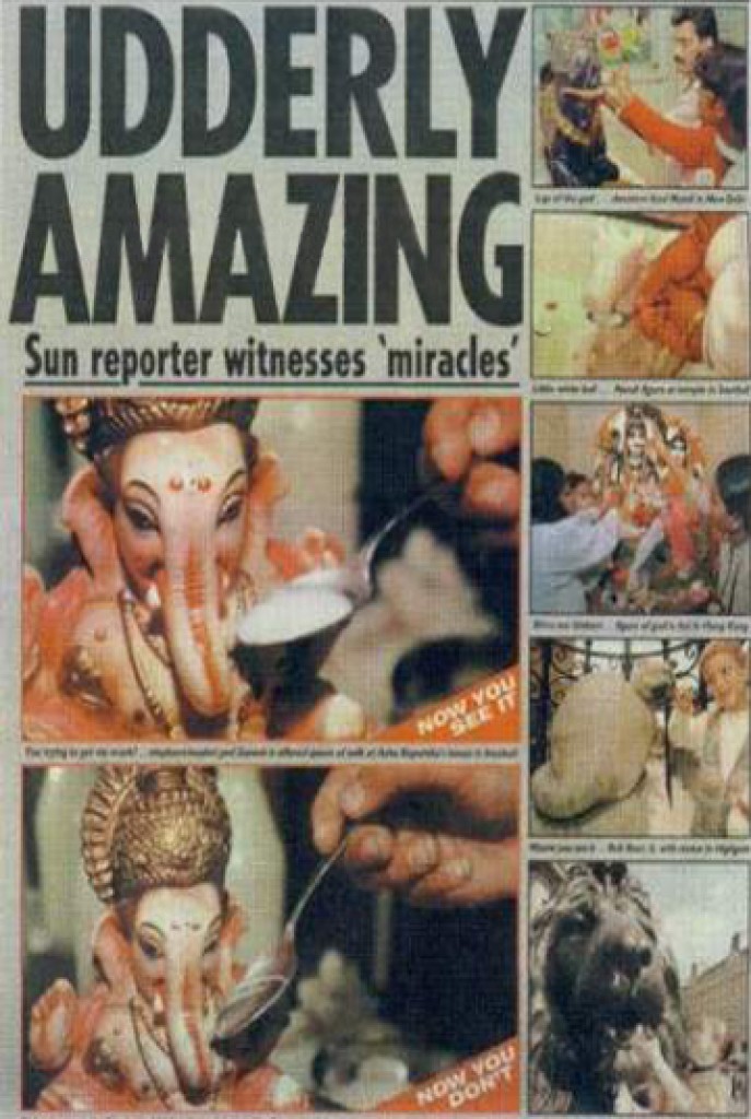 День 21 сентября 1995 года вошел в историю Индии и всего мира. В этот день произошло чудо. Все Божества стали пить предлагаемое им молоко. В один из храмов Индии позвонил неизвестный. Мужской голос сообщил, что Ганеш - Божество этого храма - хочет молока, пожалуйста, напоите Его.