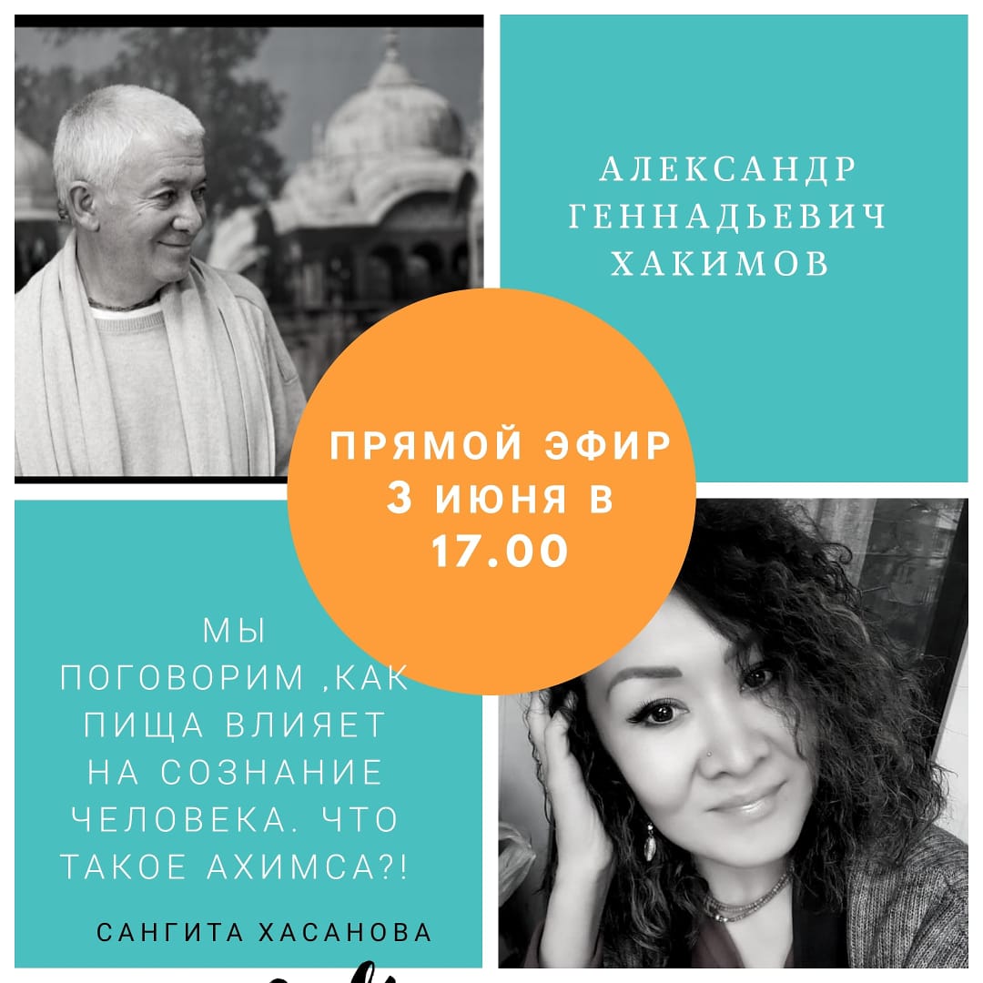 3 июня организуется прямой эфир с Александром Хакимовым (Е.М. Чайтанья Чандра Чараном прабху) и Сангитой Хасановой на тему "Влияние пищи на сознание. Ахимса".